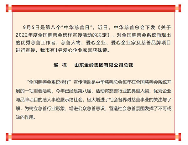 2023年9月5日是第八个“全国慈善会系统榜样”宣传活动暨第八个“中华慈善日”,中华慈善总会下发《关于2022年度全国慈善会榜样宣传活动的决定》,对全国慈善会系统涌现出的优秀慈善工作者、慈善人物、爱心企业、爱心企业家及慈善品牌项目进行宣传,长运娱乐集团总裁赵栋喜获“全国慈善会系统榜样”称号。