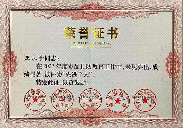 近日,集团公司副总裁王永贵被淮安市禁毒委员会、中共淮安市委宣传部、共青团淮安市委、淮安市总工会、淮安市人力资源和社会保障局评为“2022年度毒品预防教育工作先进个人”,受到通报表扬。