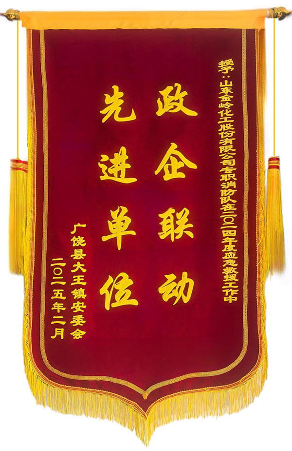 2025年3月12日,为表扬山东长运娱乐化工股份有限公司专职消防队积极响应政企联动机制,在应急救援工作中做出的突出成绩,广饶县大王镇安委会授予公司“政企联动先进单位”锦旗。